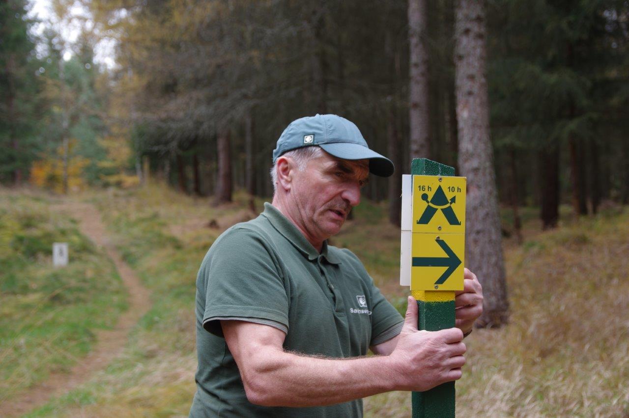 Von Anfang an hat Wolfram Claus den 2018 eröffneten Forststeig und dessen Hütten und Biwakplätze sorgfältig und gewissenhaft betreut sowie die Streckenführung verfeinert. Er suchte und fand die richtigen Stellen für Markierungen und besonders für die typischen grün-gelben Forststeigpfähle, die an wichtigen Abzweigen stehen. Auch die Betreuung der jungen Leute, die beim Sachsenforst ein freiwilliges ökologisches Jahr machen, fiel in seinen Aufgabenbereich – nicht nur sie schätzten seine Kameradschaft, seine Hilfsbereitschaft und sein Fachwissen. Auch unseren Forststeig-Wanderführer hat er mit seinem Wissen sehr unterstützt. Nun tritt Wolfram Claus zum Jahresende ins Rentenalter ein, nach 40 Arbeitsjahren beim Forst. Der Forstbezirk Neustadt hat Hartmut Landgraf gebeten, einen Text zu schreiben – hier ist er zu lesen, hier auch ein Foto. Wir sagen Wolfram Claus, sicher auch im Namen vieler Forststeigwanderer, Danke für sein Wirken für den Forststeig.