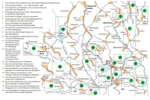 Wanderung 3 (Glashütte): Bitte im ersten Teil um das Altbergbaugebiet Hirtenwiesen auf die Wegführung achtgeben, denn die Wege sind leider am zuwachsen und nicht gut zu finden. Durch den Borkenkäferbefall waren auch sehr viele Fichten abgestorben und es wurde zusätzlich unübersichtlich. Die Markierung liegt immer in der Obhut der Gemeinde, hier Glashütte. – Die im weiteren Wegverlauf (... wenn wir die ersten Häuser von Cunnersdorf erblicken) erwähnte alte Eiche (mit Baumgruppe), an der der Weg rechts auf einen Feldweg abbiegt, gibt es nicht mehr. Man sieht nur noch einen Baumstumpf.